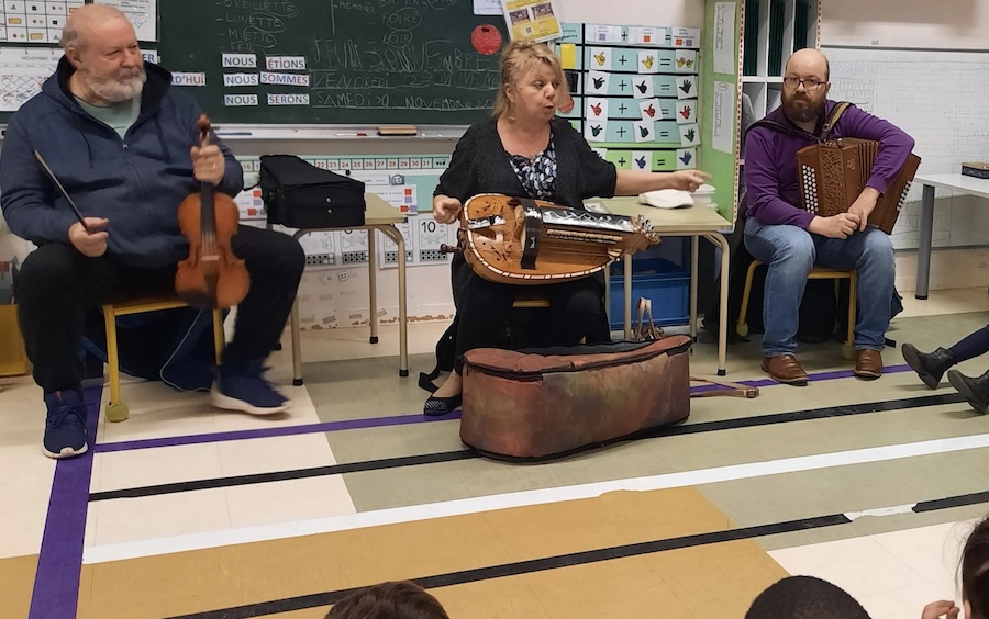Christine n’hésite pas non plus en tant que musicienne traditionnelle de vielle à roue, à se rendre dans les écoles pour faire découvrir son instrument aux enseignants et à leurs élèves, pour leur plus grand plaisir. Elle est accompagnée de son mari Francis au violon et de son fils Alexandre à l’accordéon diatonique : la musique traditionnelle, une passion commune familiale donc. D’ailleurs la famille de Christine ne s’arrête pas là, en effet, la famille fait partie également d’un groupe traditionnel appelé Les Papillons de Nuit. C’est donc vers 1994, que Christine s’est lancée dans la musique traditionnelle et vers 2010 qu’elle se lancera dans la musique dite « baroque ». Christine initie à la vielle à roue, lors d’ateliers à la MJC de Pontoise, ceux qui le souhaitent.