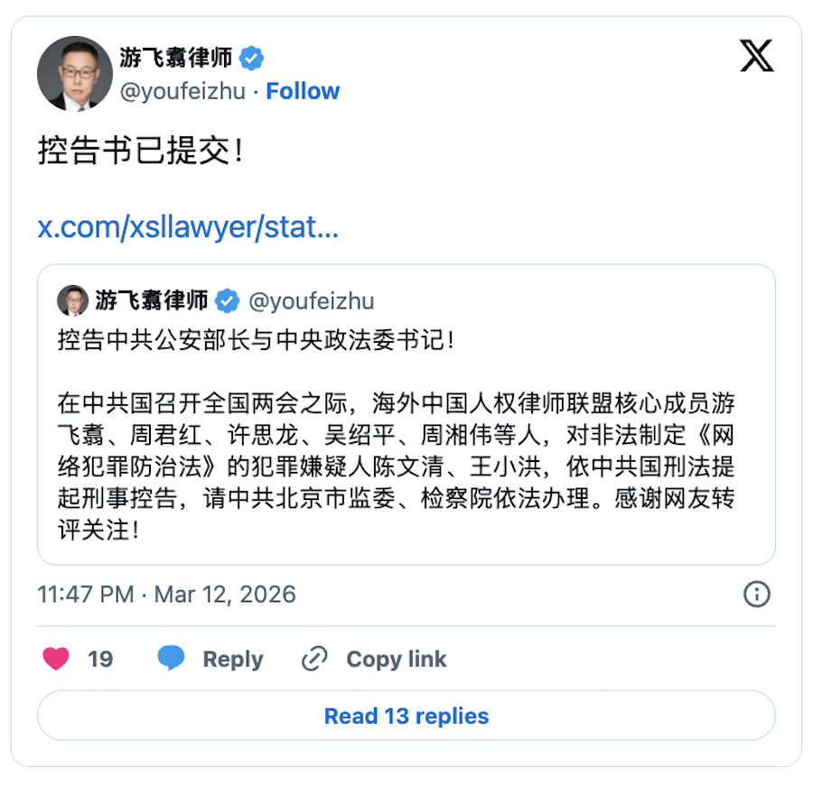 You Feizhu s’est aussi exprimé sur la menace qui pèse sur Gao Fei: des agents des autorités de sa ville natale pourraient se déplacer jusqu’à Guangzhou pour l’interroger. « C’est une méthode classique, » explique-t-il. « On utilise le prétexte de la compétence administrative liée au lieu d’origine pour envoyer des agents intimider un citoyen dans une autre ville — une forme de pression illégale dissimulée derrière une apparence de procédure. »