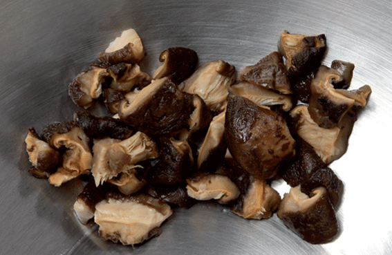 Tremper les champignons dans l'eau chaude pendant 30 mn, les équeuter et les couper en petits morceaux.