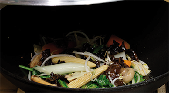 Faire revenir à feu vif tous les légumes y compris les pousses de bambou et le maïs (excepté la salade et les champignons), pendant 1mn.