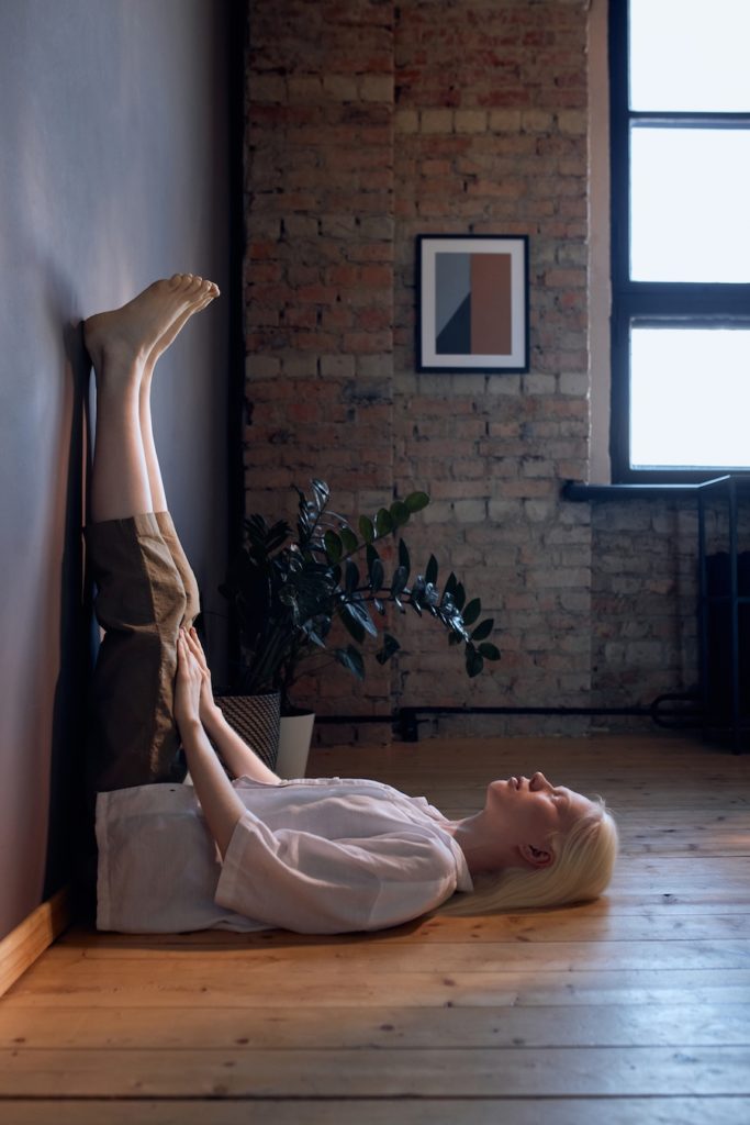 Cet exercice se pratique une à deux fois par jour (matin et soir) si votre condition physique le permet. Chaque séance dure de 20 à 30 minutes, les débutants commençant par une dizaine de minutes. Allongez-vous sur le dos, le bassin près du mur et les jambes tendues vers le haut, appuyées au mur. En cas de douleurs lombaires, vous pouvez placer un coussin fin sous le bas du dos.